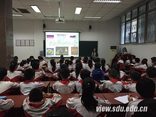 正式上课的氛围非常轻松愉悦。孩子们对外国文化都非常好奇。首先,负责人向孩子们介绍了山东大学外国语学院,它位于历史悠久、风景秀美的洪家楼校区,拥有良好的学习氛围和浓厚的文化气息。接着,负责人通过PPT,教孩子们认识国旗,并用八种不同的语言说“你好”,孩子们学习的热情都非常高涨。负责人还精心安排了游戏环节,带领孩子们做游戏来活跃课堂的气氛,并给孩子们准备了奖品。孩子们都积极举手参与游戏,玩得不亦乐乎。