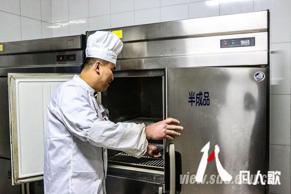 18:15,完成晚饭供应的王师傅开始巡检各项设备。作为食堂一层的安全员,他,负责查看食材存放,保证每天的食品安全。