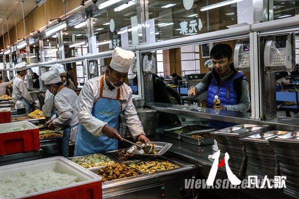 10:45:王师傅迎来了今天第一位“光顾”窗口的同学,他要了一份王师傅做的萝卜丸子和青椒豆腐,王师傅笑得很开心。“同学们的喜爱,就是对我们一天工作的最大肯定。”再过一会儿,等到同学们都完成了上午的课程,王师傅的身影就会被前来打饭的学生人群淹没。同学们排起“乌压压”的长龙,这是食堂师傅们一天中最应接不暇的忙碌时刻。