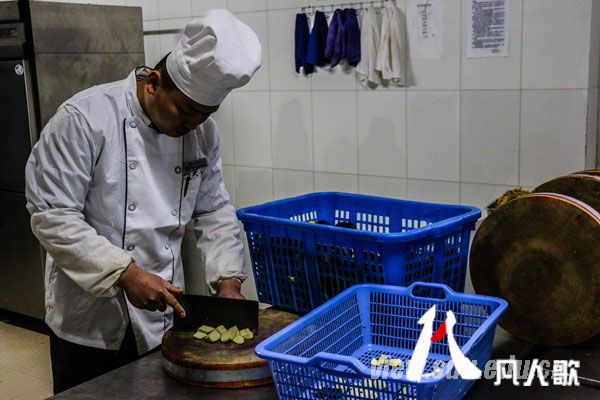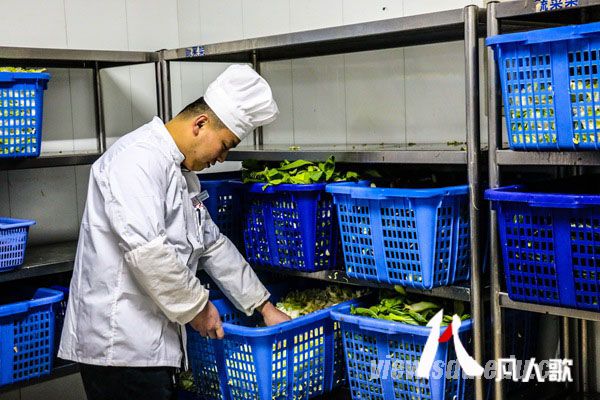 14:00:午饭的收尾工作结束,而每一场午饭战役的结束,就意味着晚饭的号角已经吹响。下午,王师傅早早开始认真地准备着晚饭的食材,不放过蔬菜上任何一点微小的瑕疵,清点这一天的菜品是否齐全。
