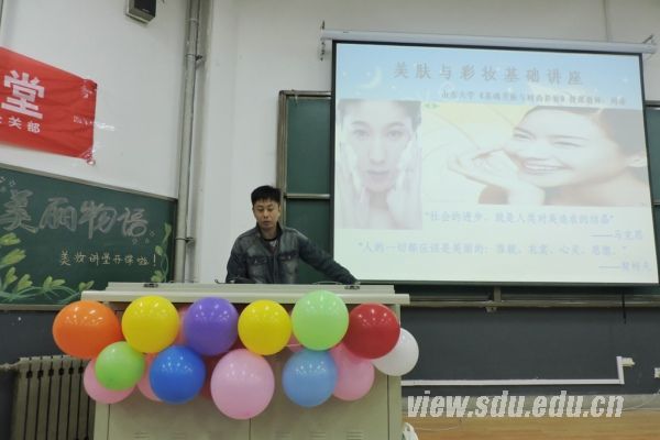 [本站讯]3月27日,外语学院在洪家楼校区举办了“美丽物语”美妆知识讲堂。讲座邀请到山东大学基础美肤与时尚彩妆课老师周睿担任主讲。香港新昇美业总经理宋金丽及业务经理孙志远作为嘉宾出席。