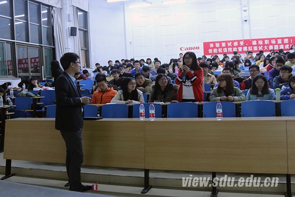 19日,由山东大学信息学院学生会与政管学院学生会联合举办的模拟面试大赛赛前面试培训会在山东大学兴隆山校区召开。本次培训会由朗阁英语人力资源总监陈岩、龙湖地产济南分公司招聘经理黄宏主讲。