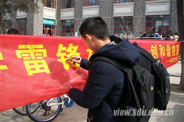 [本站讯]3月5日,由公共卫生学院社会实践部组织的纪念雷锋同志的“学雷锋树新风,创和谐校园”活动在山东大学趵突泉校区的餐厅前举行。