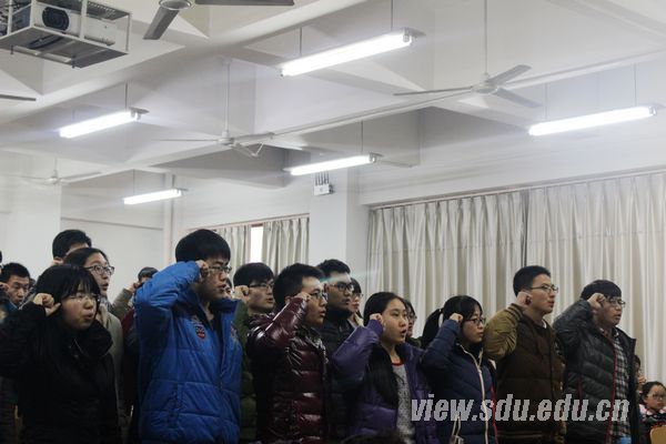 会议伊始,全场齐唱国际歌,在辅导员谷国超的带领下,新党员庄严宣誓,许下了对党的承诺。陈淑慧、祝语、袭著聪三位同学先后代表新党员、老党员、入党积极分子发言,以不同的身份讲述了对党的理解和感受。入党宣誓大会在国歌的歌声中结束,同学们用整齐的歌声唱出了对党对国家的热爱。在接下来的表彰大会中,会议先后表彰了2014级数学竞赛获奖同学以及学院优秀团支部,并宣读记录材料学院学生日常活动的红头文件。会议最后,王丽君对此次大会进行总结发言,她首先对新老党员提出了要求,表达了对他们的期望,同时向在场同学强调了学习的重要性,提醒同学们要合理分配时间,做有意义的事。