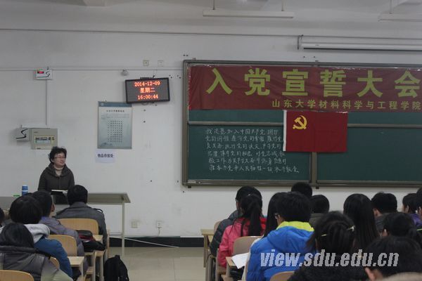 入党宣誓大会暨12•9表彰大会的成功举办,加深了同学们对党和国家的认识和热爱,使他们以更积极饱满的热情对待学习和生活。大会由2012级学生本科党支部宣传委员童坤主持,材料学院各年级辅导员、学生党员、入党积极分子以及学生代表参会。