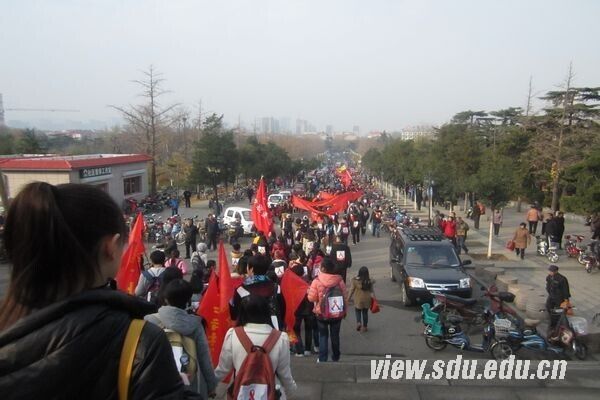 上午8点,公卫志愿者们提前来到英雄山广场进行准备工作,先将绘有红丝带的海报贴在书包背面,再进行条幅与竹竿的组装,市中区疾病预防与控制中心的老师贴心地为众人准备了手套,做好准备工作的公卫志愿者们列队整齐,整装待发。9点,活动正式开始,公卫志愿者队从英雄山广场出发,高举“美好青春我做主,防艾控艾我为先”、“关‘艾’之路,你我同行”等条幅翻越英雄山,身体力行传播艾滋病的相关知识。环山而行回到广场的一个小时内,志愿者们途经多条繁华街道,让许多人对艾滋病有了初步认识,更向众人展示了大学生们对艾滋病防治的重视与决心。