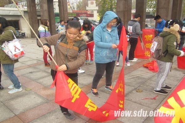 [本站讯]11月29日,在世界艾滋病日即将到来之际,公共卫生学院的志愿者们在英雄山广场参加了由市中区疾病预防与控制中心组织的大型艾滋病防治宣传活动——“为‘艾’走泉城,我们在一起”宣传活动,以呼吁市民向零艾滋迈进。