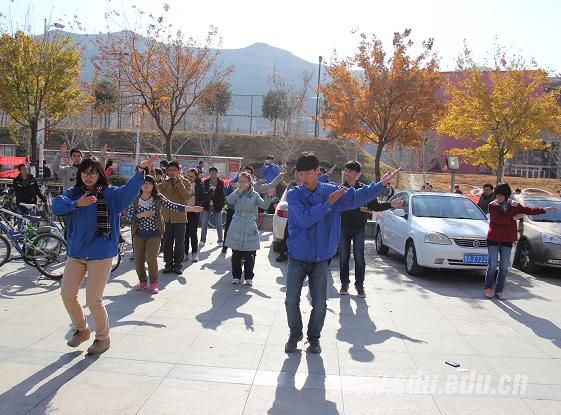 11时50分,正是学生下课的高峰期,参加活动的同学已到达实验楼前。几分钟过后,音乐响起,学生迅速就位,跟着音乐欢快地跳起来,吸引了大量同学驻足围观,有的甚至饶有兴致地跟着跳起来。舞蹈过后,干事们立刻集中,齐声喊出:“我们是有朝气、有爱心、有拼搏精神的大学生。山大心,中国梦,我们一起飞翔!材料青志协祝山大学子国际大学生节快乐!” 同时拉开世界大学生节的横幅,然后四处分散,迅速离开。