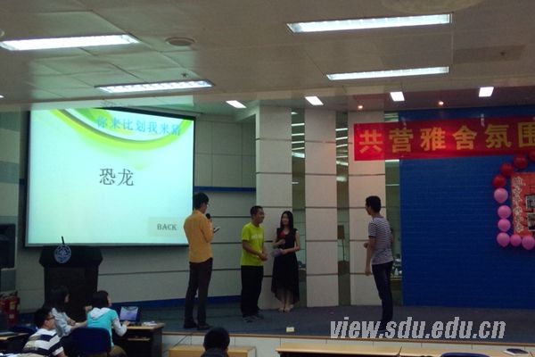 出席本次活动的嘉宾有软件学院团委副书记孙朋朋,学生会主席杨宇,学生会副主席郭邯。同时各位同学也积极参加到本次活动中来。比赛在“共营雅舍氛围 同创温馨生活”的口号声中正式拉开了帷幕。比赛分为才艺展示和默契大考验两个环节。宿舍才艺展示环节,选手们匠心独运,各有特色。有文艺青年弹着吉他和舍友们引吭高歌,一首《一个像夏天一个像秋天》让在场的观众深切体会到她们之间深切的感情。有的为大家上演了精彩又经典的二人舞蹈,搞笑的舞风,帅气的舞姿让现场气氛更加火热。还有的通过朴实的文字、ppt上生活照的展示和一首《和你一样》的深情演唱,让观众们在淡淡的讲述中体会到他们之间浓浓的友情。更不乏搞笑青年为大家带来的双簧,重写《白娘子传奇》……宿舍成员齐上阵,节目丰富多彩,笑料百出,让现场气氛高潮迭起。