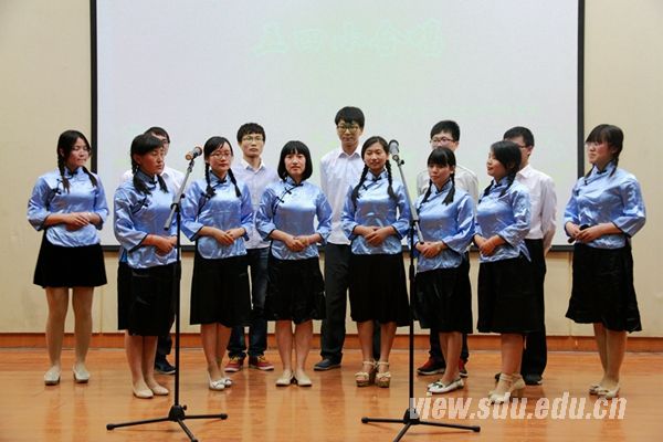 13级3班的女生们穿着粉红色院衫,手牵手唱着《山大校友之歌》上场,柔美的声线展现出山大人对母校深深的热爱;13级1班的同学们用激扬的《山东大学校歌》唱出了山大学子心中的自豪感;12级1班的《让世界充满爱》向在场所有观众传达了关爱他人、传递爱心的大爱情怀;12级2班用一首精心编排的《相亲相爱》将现场气氛推向了一个小高潮;12级3班则用纯熟的唱法和默契的配合以及诗朗诵,演绎了经典曲目《茉莉花》。13级2班的《中国,中国,鲜红的太阳永不落》和12级临药制药联合队的《保卫黄河》,男声雄浑,女声高亢,歌颂了先辈革命者们在漫长建国路上为自由、民主作出的不屈奋斗。最后上场的11级3班结合蒙山实习经历,带来了一首饱含深情的《沂蒙山小调》,唱出了心中对美好记忆的留念,也唱出了对药学院的真挚情感。