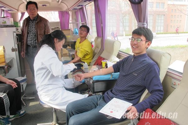 而另一边,同学们也积极地回应着“志愿”一词:此为双向的奉献。献血车上人流络绎不绝,许多同学自发前来献血。签订协议、资讯近况、最后化验抽血。记者进入献血车进行采访,碰到一位首次参与献血的同学。忍着痛献完血后,他如释重负地一笑,接过献血证书,满脸的欢欣。不错,在中国血库经常告急的今天,我们需要更多的人无私地参与到献血的行列来,也许你的简单之举,就可以拯救一个鲜活的生命。