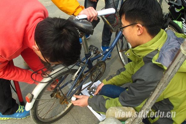 活动一开始,自行车维修摊前便是门庭若市,许多同学拿来自行车前来修理。志愿者们接过自行车,蹲下身来,开始检查其问题。给轮胎打气,检查手把、刹车、齿盘、飞轮,然后开始转着链条上润滑油。修理同时,还不忘和前来的同学进行交流如何保养自行车的方法。娴熟的技巧、愉悦的神情,仿佛是在对待自己的爱车一样,更是在传递着,志愿服务的精神:在帮助了他人的同时,也使自己,更为充实。