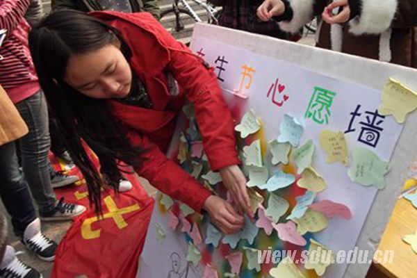 3月4日,土建学院女生部的干事们正式开展心愿便利贴活动。活动期间,干事们于欣园西门摆开展台,广泛收集女生提出的相对容易实现的心愿。活动从一开始就进入了良好状态,许多同学踊跃参加活动,女生们写出了祝福卡片,在女生部成员的协助下亲手把卡片挂到彩色气球装饰的展板上,将祝福传递给每一位同学。积极参加活动的男同学将会把纸条摘下,按照女生预留的联系方式与女生取得联系帮她们完成心愿。心愿便利贴活动将持续至3月7号,并于当天晚上8点举行放飞孔明灯的活动。