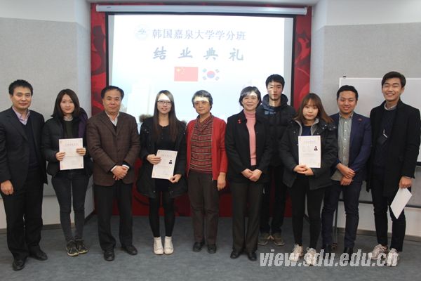 学院汉语教学部老师李昊天在致辞中回顾了一年来同学们在汉语学习和专业课学习中取得的好成绩,希望学分班同学回国后可以给家人朋友介绍中国的社会、经济、文化,学有所成,学以致用,成为中韩文化交流的友好使者。嘉泉大学学生代表黄贤贞在发言中向一直关心和帮助同学们的学校老师表示深深的感谢,表示回国后一定要继续努力学习汉语,以后还会到山东大学来。随后,徐关众、刘明利等领导老师为同学们颁发结业证书。国际教育学院教师代表、有关行政办公室主任及嘉泉大学长期学分班全体同学参加结业典礼。