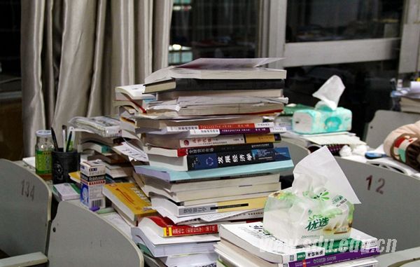 晚上9:30,理综楼。彼处挑灯夜读,此处也是鏖战正酣。理综楼的考研专用自习室里,高高堆积起的书本,散在桌子上的纸笔,冒着热气的水杯,以及埋头读书的背影。远离游戏,暂别小说,考研注定是一条孤独的旅程,哪怕道阻且长,也要为自己代言。