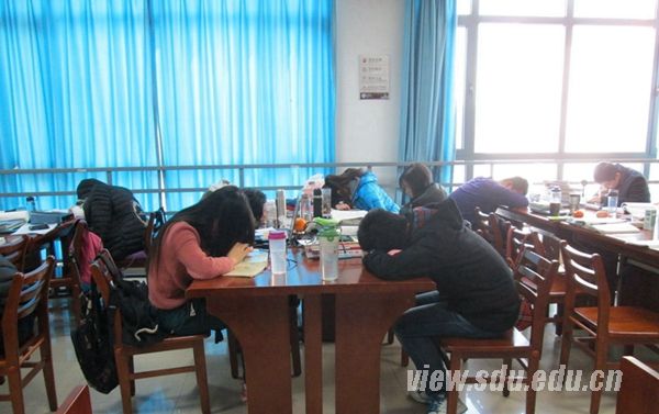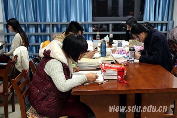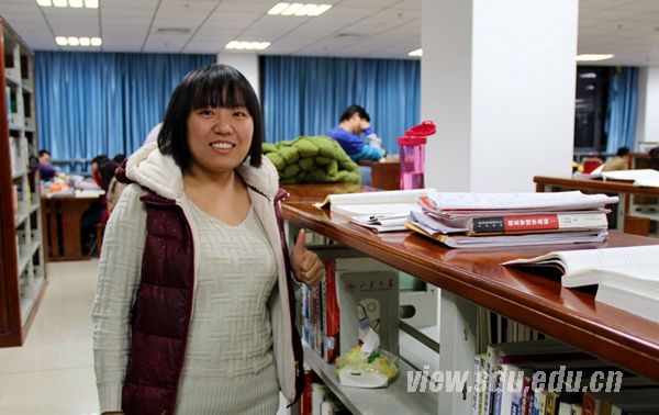 赵玉是历史文化学院2010级档案学专业的本科生,她的考研志向是中国人民大学。距离2014年1月4日到5日的研究生笔试已不足一个月,赵玉的备考路却已经走了很久。从大三暑假的留校补习,到日复一日的习惯早起,她已经适应了准备考研的节奏,享受着拼搏中的充实和快乐。早上6点半起床,7点到图书馆渡过一天时光,晚上9点半蒋震闭馆后,再转战知新楼,直到将近十一点才赶回宿舍。
