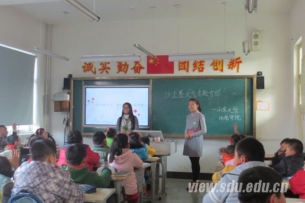 12月20日下午,环境科学与工程学院清泉环保协会的志愿者们来到济南市经八路小学为小学生普及沙尘暴天气的相关知识,志愿者分成了四组,对四个班级的同学分别进行了环保知识的宣传普及。