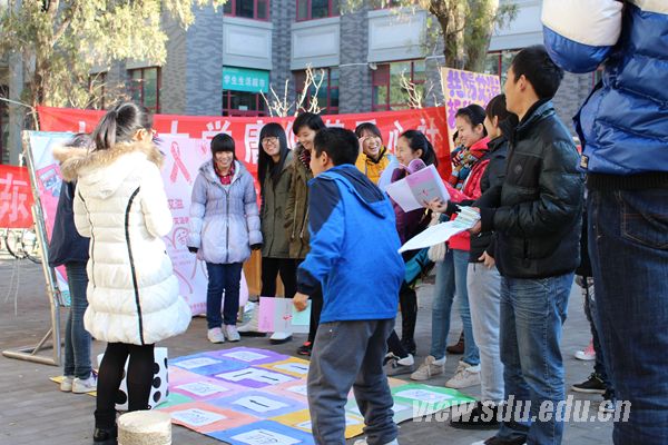 活动主要由“共防艾滋,拒绝歧视”宣传、知识有奖问答、“大富翁闯关游戏“三部分组成。活动伊始,大家以活泼开放的形式呼吁大家“共防艾滋,拒绝歧视”。随后的有奖问答环节中,大家将系有红丝带的答题卡片拼成一个心形,传递着与“艾”同行的美好希冀。在社员们热情地宣传下,同学们纷纷驻足,争相答题,在亲自参与中了解艾滋病的现状,学会理解并关爱艾滋病人。“大富翁闯关”游戏中,参与者以答题闯关拿奖的独特形式进一步认识艾滋病,既收获了快乐,又增长了知识。在两项活动进行的同时,社员们向周边同学发放艾滋病知识读本和宣传手册,讲解有效预防艾滋病的相关知识,呼吁他们拒绝歧视,给艾滋病人更多关爱。整个活动现场不时传来参与者的欢声笑语。社员们答疑解惑时的专注神情、热情微笑,也为这个严冬增添了一抹亮色。活动的整个过程中,人来人往,参与者络绎不绝,收到了良好的艾滋病宣传效果。最后,活动在温馨欢乐的气氛中结束。