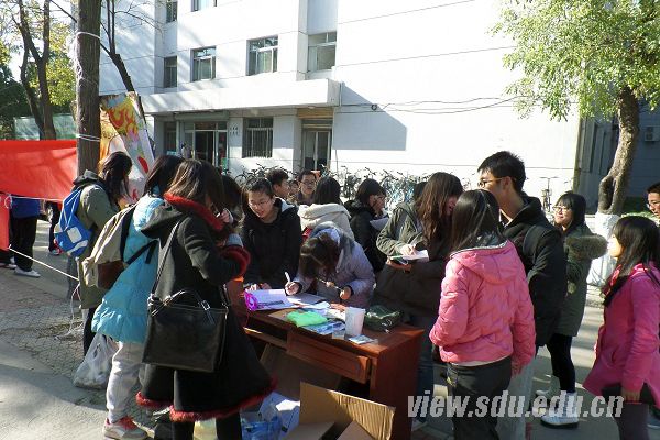 11月30日,红丝带制作及宣传活动于山大软件园校区展开。青志协工作人员通过向行人发放宣传单,介绍世界艾滋病日的由来及活动开展的目的,希望能普及艾滋病知识,消除对艾滋病人的歧视;发放调查问卷,调查大学生的身心健康状况及对艾滋病的认知。同时,鼓励行人参与“红丝带传情”活动,即在工作人员提供的红丝带上写下对艾滋病人的寄语,然后将红丝带系于树上,表达对艾滋病人的祝福。