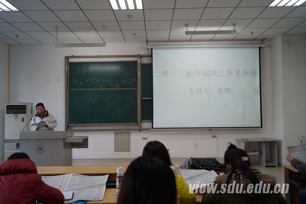 [本站讯]11月17日,《山东大学报》学生记者团2013年度培训会在中心校区举行。记者团团长陈龙主持会议,校报编辑贵明作了题为“2013年编辑稿件中的所学所感”的演讲。学生记者团全体成员参加培训会。
