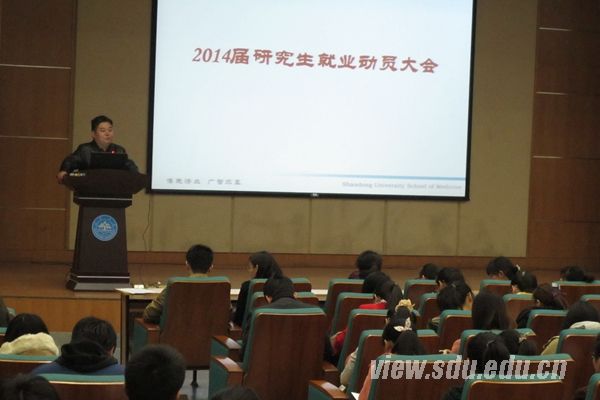 [本站讯]11月15日晚,医学院在趵突泉校区举行了2014届毕业生就业动员大会。由医学院党委副书记赵福昌主讲,详述了2008至2013年山大校医学专业毕业生的就业情况,以现实为依据,以经验为基础,鼓励同学们在2014毕业季中提早准备,占领先机。全体研究生辅导员也参加了动员会。