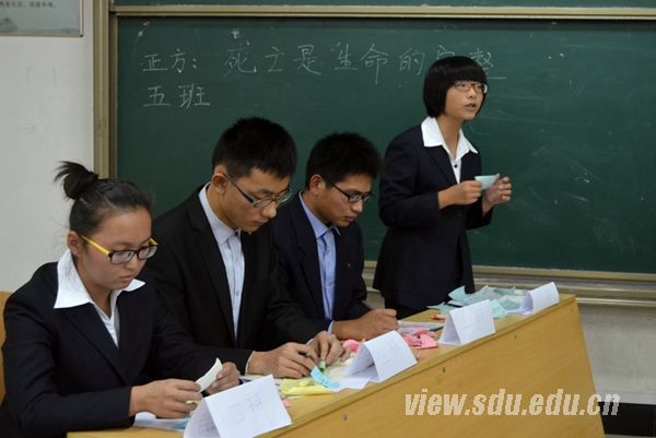 本场辩论赛围绕“死亡是生命的完整还是遗憾”这一辩题展开。正方热工五班的观点是死亡是生命的完整,反方工生基班认为死亡是生命的遗憾。本次比赛共设上下两个半场。上半场是双方的开篇立论,经过辩手自我介绍及主持人宣读比赛规则后,双方分别进行了二辩攻辩、三辩对辩以及阶段小结三个环节,中场休息后,开始了下半场的自由辩论环节。反方三辩通过列举“小悦悦事件”从多方面说明了生活不仅在于呼吸,更重要的是自身价值的实现。正方四辩对此提出了反驳,强调永生并不一定能创造更多的价值,而死亡是生命旅行的结束,死亡代表着生命的完整性。双方辩手都妙语连珠,精彩纷呈。观众们掌声如雷,现场气氛热烈。