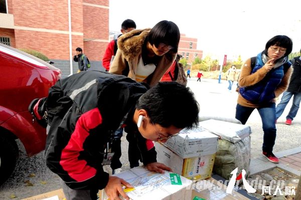 快递员熟练快速地拆开快件包装,取出确认单,一式两份,一份交由同学留好,另一份自己保管最后交由公司。伴随着气温的降低以及“双十一”临近商家折扣的影响,每一位快递员的工作量都增加了不少,但确保每一件快递都能够安全迅速的送到同学们的手中仍然实打实地烙在每一位快递员的心里。