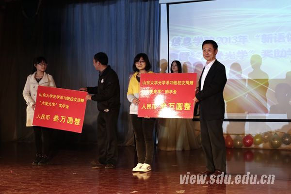 迎新晚会在山东大学摇滚山大H.I.T乐队激情四射的摇滚风表演中拉开帷幕,点燃了观众热情。王卿璞代表学院领导发言,他首先向2013级新生的到来表示欢迎。王卿璞指出,大学生代表着青春、活力、激情、未来和希望。同学们来自五湖四海,为了共同的目标相聚在此,大家应珍惜这种弥足珍贵的友情。此外,王卿璞对新生寄予殷切希望:第一,希望大家努力学习,全面发展;第二,希望大家在大学期间严于律己,宽以待人,创造小的和大的和谐环境。晚会上同时进行了“大爱光学”奖助学金颁奖仪式。山东大学光学系79级校友、齐鲁证券李涛和省公安厅闫雷为获奖学生代表颁奖。李涛还代表山大光学系79级全体校友表达了对母校培育之恩的感谢,同时对新生寄予厚望,希望新生把握好机会,发挥特长,毕业后也能回报母校,回报社会。