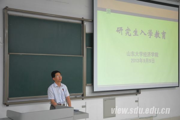 李长英对全体2013级研究生加入经济学院表示祝贺和欢迎。他详细介绍了经济学院的学科专业、师资队伍、办学规模、学术资源、国际化办学战略以及与国际知名大学的合作等方面情况。他指出,经济学院近几年发展迅速,是学院老师和学生共同努力的结果。他告诫研究生新生努力学习,在研究生期间努力充实自己、提升能力,以报答社会,报答父母,报答学校。陈宏伟从学校历史、学术实力、学校规模等方面向研究生新生介绍了山东大学的概况,同时介绍了学院的发展概况及优秀校友,希望新生尽快适应环境,合理利用学校学院提供的资源和平台,努力成为一名对社会有用的人才。研究生办公室相关老师就研究生选导师、培养计划制定以及日常注意事项等作了工作安排。