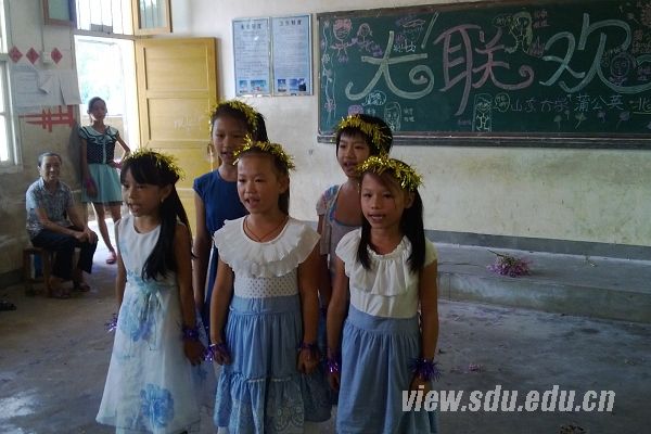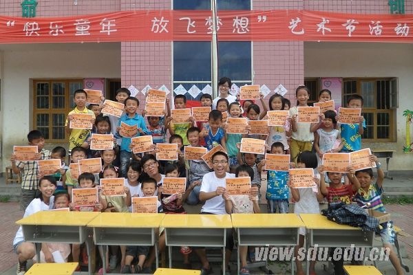 每周队员们将为孩子们上五天的课,在周六,是新奇快乐的周末集体活动。活动策划人乐乔佳精心准备了“留住夏天植物剪贴画大赛”、“我们的奥林匹克”以及大联欢三次集体活动。第一周队员们组织孩子在附近的路上采摘各种树叶与花朵,让他们在纸上剪贴出各种美丽的图画,一起留住美丽的夏天;第二周则利用带去的各种体育器械,开展起欢乐多多的趣味运动会,夹球跑、定点投篮、定时跳绳、“保龄球”……运动与快乐相结合的夏天,孩子们理解着竞争与合作的意义。每一次比赛,队员们都会提前写好奖状准备好奖品,让每一个孩子都感受到自己是独特的,充分理解“友谊第一,比赛第二”的含义。而到了离别的最后一周,大联欢上孩子们用歌声、舞蹈与稚嫩的朗诵,传递着对志愿者的喜爱与不舍,队员们也连夜排演一场讲述支教故事的短剧,将二十天来发生的事情一一上演。联欢会的最后,队员们纷纷寄语孩子们,期望他们能健康快乐地成长。