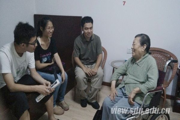 下午五时许,调查团结束了对蔡公时纪念馆的调查活动,冒雨赶赴济南西郊党家庄的一家敬老院,对蔡公时之女蔡今明女士进行了采访。蔡女士见到队员们非常激动,在了解调查团此行的目的之后,她积极地与队员们进行了交流。蔡女士虽已86岁的高龄,但是谈到其生父蔡公时烈士时,她的记忆仍然清晰,将蔡公时的一生娓娓道来。当谈到日军对革命志士的暴行时,她的眼角微微湿润了,队员们也都被蔡公时烈士英勇无畏的革命精神所打动。之后,在谈及“中国梦”时,蔡今明女士从她早年的经历说起。在那些教育资源贫乏的年代,她仍坚持自己的梦想,不断的学习。后来进入工作岗位,她先后任职于中国人民大学校医院、华北大学校医院、华东石油大学校医院以及山东大学校医院,一步步走向了现在安稳幸福的生活。蔡女士告诫队员,一定不要松懈,“中国梦”应当让大学生意识到肩头的重担,这也要求大学生一定要掌握好自己的专业知识,日后在自己的岗位上为“中国梦”出一份力。只有每个人通过努力实现了自己的梦,国家和民族才能强大,才能让“济南惨案”永存史册,不再上演, “中国梦”才不会变成空谈。