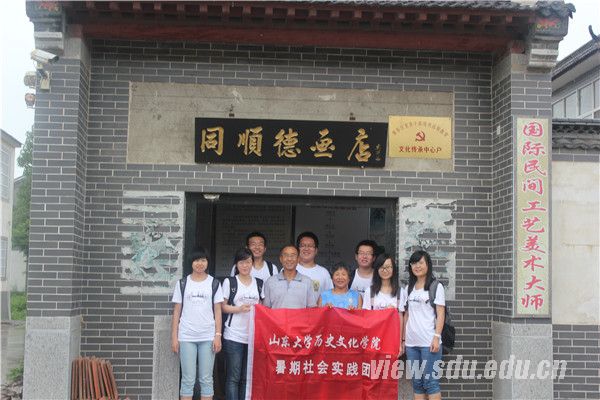 [本站讯]7月12日,山东大学历史文化学院“花样年画”暑期社会实践队伍一行到达位于潍坊市寒亭区的杨家埠村,拜访国家级非物质文化遗产项目杨家埠木板年画的代表性传承人——杨洛书老先生,并参观了杨家埠民俗文化大观园。
