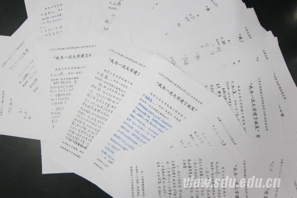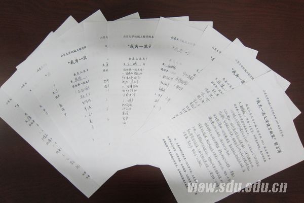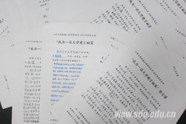 围绕山东大学创建世界一流大学的目标,机械学院2009级毕业生党员通过召开座谈会、设置留言薄等方式,广泛征集了毕业生党员对学校发展的意见和建议。活动开始后,党员同志本着认真负责的态度,针对学生会的工作、专业课的课程设置、考试的题目、学院实验仪器设备的条件以及学生心理教育等方面遇到的问题组织学院老师与学生的交流,并提出了自己的积极建议。比如,2009级机电班党员张鹏同学提出了“校园特色化建设“的建议,建议山东大学要有自己特色的校园文化,特色的人才教育模式、特色的学科建设。2009级工业设计党员胡雁榕同学提出了“科学研究上加强分类管理,人才培养实施多种模式”的建议,积极向母校献策。