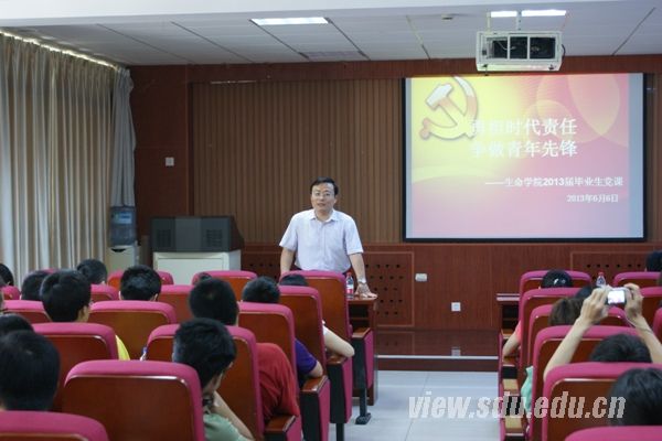 [本站讯]6月6日下午,生命学院2013届毕业生全体党员齐聚生物北楼,共同聆听毕业前的最后一堂党课。党课由学院党委书记郑晓健主讲,院党委副书记李海燕主持,院党委副书记韩春岫及毕业生辅导员张攀一同出席。