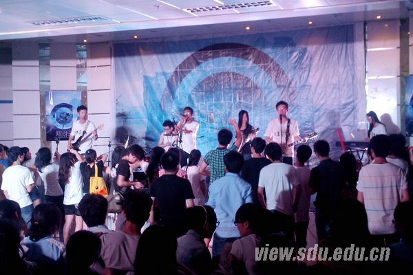 随后,洛神乐队邀请计算机科学与技术学院09级嘉宾为大家表演。首先上场的是陈涛,用自己深厚的音乐功底为大家唱了一曲《坚强的理由》。接下来由王梦霜和夏菁为全场观众合唱了一曲《梦醒时分》。更令全场欢呼雀跃的是藏族嘉宾旦扎为大家演唱的《圣地》,汉语与藏语的完美结合,让《圣地》近乎完美的呈现给大家。场下的藏族观众也用藏语跟着旦扎大声歌唱。全场一片沸腾,欢呼声此起彼伏。