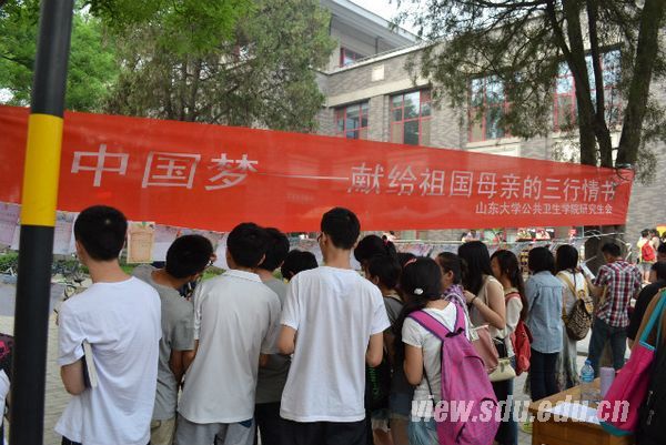[本站讯]为响应教育部党组、共青团中央发出在师生中深入开展“中国梦”主题教育活动的要求,公共卫生学院研究生会举办了以“中国梦——给祖国母亲的三行情书”为主题的征文大赛。院党委副书记李士保、辅导员班梦姣作为指导教师,学院全体研究生参加大赛。