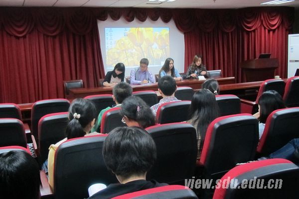 在主持人进行开场介绍后,由申请到英国莱斯特大学的2009级本科生王娟同学首先发言。她列出几个常用的进行英国留学信息查询网站后,就留学申请的步骤如准备申请材料、投递申请等进行了详细的讲解。此外,她还特别提到,9月到12月是最佳申请时间,要努力找到对口的实习机会。之后,2009级本科生刘德铭同学则带来了《怎样写好个人陈述》的材料,就英国大学的排名状况、留学费用以及他所申请到的英国杜伦大学进行了介绍,重点讲解怎样写好申请留学的个人陈述。他建议写作根据不同学校的要求,要突出自己的特色和亮点。申请到加拿大阿尔伯塔大学和香港中文大学两所学校的2010级研究生陈静与大家交流了关于留学申请过程中可能出现的一些问题及解决办法。