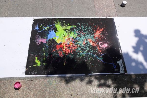 比赛之前,工作人员将百米画卷摆放在欣园门口,引来同学们的纷纷围观。他们看过实长百米的画卷和五颜六色的水粉后赞叹不已,纷纷表示明年一定要参加这个比赛,来这里画下自己未实现的梦想,工作人员对此表示了热烈的欢迎。上午9时,比赛正式开始,来自四个学院的40多名选手纷纷就位。选手们认真思考着自己的梦想,希望给观众们呈现出真正体现山大学子才情的画卷。第一位动手作画的选手用黑色的颜料打底,画出一块黑色的长方形区域,接着调出各种色彩,用泼墨的方式将红、绿、蓝、粉、黄等颜料泼到黑色底面上。这位同学解说道:“虽然画中没有明确的主题,可是它的寓意还是很深刻的,青春就像这幅画一样,挥洒着各种色彩,每个人都会在这些色彩中努力实现自己的梦想”。意味深长,引人深思。正午12点,烈日骄阳下,选手们仍在待续,他们伏在在地上巧妙设计、点染色彩,作品风格迥异。有的还搭配着遒劲的书法,灵动的动漫,展现了选手们的别样风采。下午1时,起初纯白的画卷变得缤纷绚丽,观众们赞赏不已。