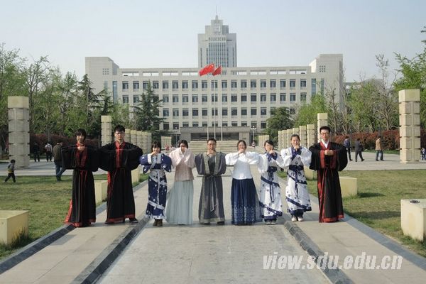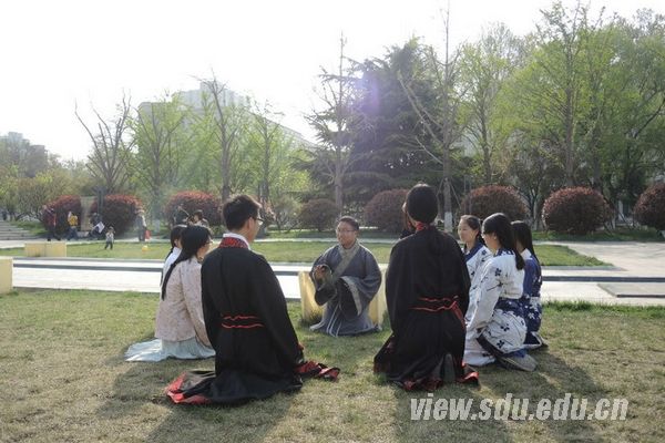 春花烂漫之时,国学社的九位同学身着汉服,穿行在风景如画的大成广场,行经小树林、稷下广场等中心校区的著名景观。具有汉民族特色的美丽服装一下子就吸引了众多行人的目光。许多同学和中心校区的游客纷纷上前与国学社成员们合影。社员们耐心地向大家介绍汉服的基本知识,并且悉心解答大家提出的问题。大家纷纷表示,汉服是汉民族的传统服饰,从来没有离开过人们的生活,并呼吁更多的人来了解和喜欢汉服。