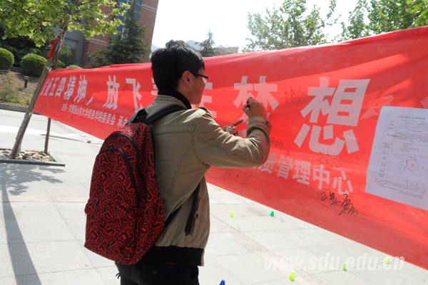本次活动主要包括“中国梦、青年梦,我想大声说”、“签名送祝福”、“答问题,唱团歌,欢欢喜喜拿奖品”等内容。工作人员积极地向过往的同学们介绍着活动的内容,同学们也对此十分感兴趣,纷纷拿起签字笔写下对祖国的祝福,对中国青年的祝愿,“壮哉我中国少年”、“中国梦,我们一直在路上”、“做新世纪的有为青年”等一句句发自肺腑的话语都表达了同学们内心最坚定的想法。送完了祝福,签完了字,再来答问题,赢奖品。“1919年五四运动的导火索是什么?”、“五四精神的核心内容是什么?”、“十八大报告中提出的全党都要坚持的‘三个自信’是什么?”同学们或冥思苦想,或讨论商议,一个个问题被解决,很开心地拿着通过自己努力得到的奖品。没有答对的同学表示回去一定要多做这方面的功课,加强对中国历史和中国共产党的了解。