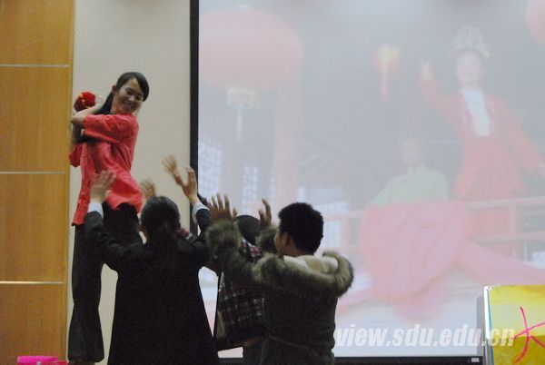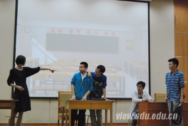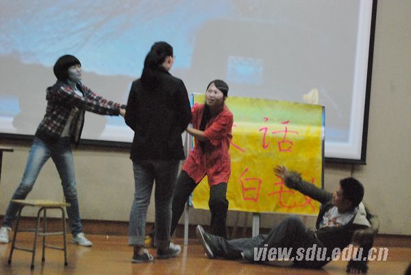 八支来自趵突泉校区和软件园校区的代表队参赛。护理学院代表队由12级的七名学生组成,作品为《大话白毛女》。《白毛女》作为经典之剧,旨在突出“旧社会把人变成鬼,新社会把鬼变成人”的主题,而本次表演者中的导演由《大话西游》想到为何我们不能《大话水浒》、《大华三国》、《大话红楼》,从而引出剧本主题。剧情情感丰富,分别用“树上的鸟儿成双对”表现《大话白毛女》的古典,用《泰坦尼克号》经典情景演绎浪漫,用“抛绣球”的欢快音乐表现搞笑之风。主角淋漓尽致的展现耍酷、扮蔻、玩前卫、爱另类的新新人类思想,主导否定一切、打倒一切、蔑视一切、结构一切的反面行为。最后在无奈中意识到“大话”的迂腐、无意义、无价值,呼吁人们尊重经典、重视经典、切勿盲目跟风。