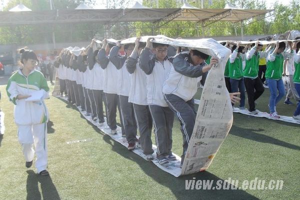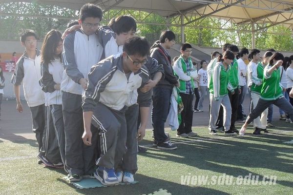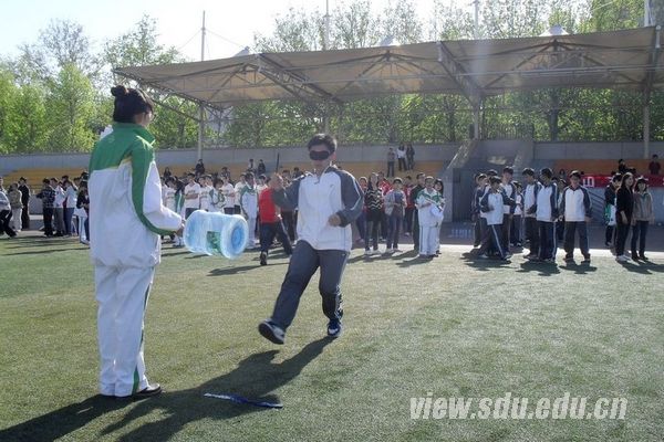 下午4时左右,运动会正式开始。在开场的手语操表演中,生院运动员统一服装,用整齐划一的动作、春激扬的热情、舞动的双手,完美地诠释了《感恩的心》。接下来进行的四个比赛项目,队员们相互帮助、配合默契。“火车快开”中段出现了节奏不稳、步伐不均匀,个别队员摔倒的现象,但是队员们最后都牢牢抓住队友的肩膀,抓紧时间整理队伍继续前进。“瞎子敲锣”中,队员们都是百米冲刺般争分夺秒。“泰坦尼克号”中队员们团结协作、互帮互助,争取了时间优势。“无敌烽火轮”中队员们在用报纸围成的纸圈中协同前进,用完美的配合为本次比赛划上了句号。