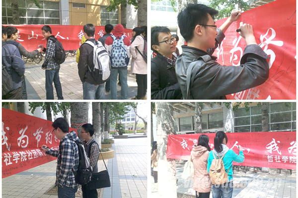 [本站讯]4月18日上午,哲学与社会发展学院社团联合会发起“我是山大人,我为节约代言”师生联名签名活动。