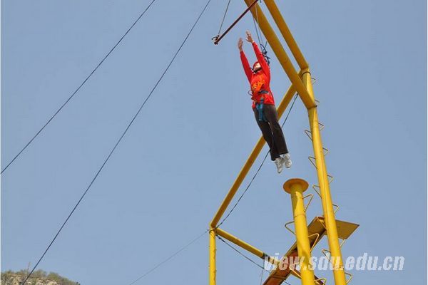 户外素质拓展训练在清晨明媚的阳光中拉开序幕。训练正式开始前,按照教练的要求,同学们随机分成两组并进行了确定队长、队名、队徽和队歌等环节的团队建设,随后在各自教练的带领下分队开展素质拓展活动。上午的项目是“高空单杠”和“真人CS枪战”。“高空单杠”要求同学们克服恐惧心理攀爬到十米左右的铁柱上,并完成跳跃抓住单杠的动作;而“真人CS枪战”则更多的考验同学们的身体素质和合作能力,包抄、突击、围剿等精妙的配合也展示了同学们的临战意识和战术思想。
