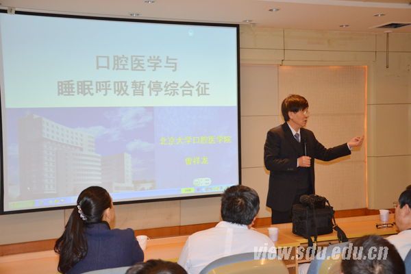 徐欣代表学院向曾祥龙和赵弘的到来表示了欢迎。徐欣说,口腔正畸是口腔专业领域里重要的学科,也是口腔医学院的重点专业。曾祥龙、赵弘此次来访交流,会使山大口腔正畸学科的临床科研得到进一步提高。曾祥龙主讲的内容是“口腔矫治器治疗OSAHS的研究”。他从多种角度详细解析了OSAHS病因,重点阐述了口腔医学介入这一全身疾病的依据,并结合人体组织结构学从口腔角度对OSAHS的病因和口腔矫治器治疗进行了深入的讲解,为正畸科新的治疗项目OSAHS的开展起到了积极的推进作用。赵弘主讲“直丝弓时代的重要临床手段Pd法弓丝弯制训练 ”的内容。他运用大量视频、图片等资料,结合自身丰富的临床实际操作案例,为在座的观众详细阐述了该技术的应用及其优势,对正畸临床基础训练的规范建立了标准。