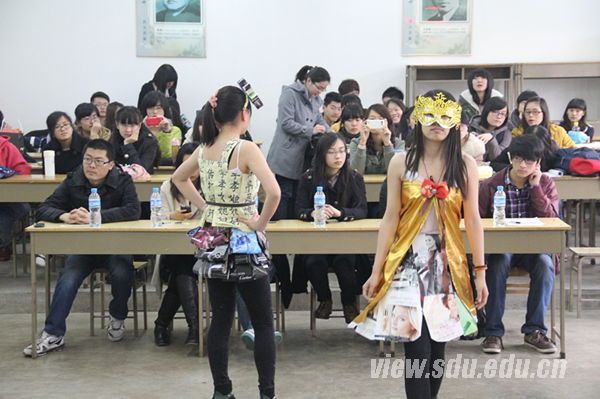 此次比赛的评委是趵突泉校区环保协会、动漫爱好者联盟等六个社团协会的会长。活动中,主持人首先介绍了比赛规则,23个队伍共分为4组出场,每个队伍对时装。进行现场模特与解说,每组各个队伍展示完毕,还要进行环保知识问答,根据各个队伍答对题目的个数计入分数。23个队伍的服装给现场观众带来一场视觉盛宴。用废旧窗帘设计的“一窗幽梦”,把观众带入一场美轮美奂的古典幽梦;用旧报纸做成的“巴洛克印象”,清秀却不失高贵华美,让人过目难忘;SXN团队把用过的宣纸做成“花开花落”、“云卷云舒”、“有凤来仪”、“曲院风荷”四件裙子,有动听的名字,带给大家无尽的回味。23个队伍各有所长,不断博得现场观众的阵阵掌声,精彩时装秀引来教学楼工作人员和翘课而来的同学的围观。比赛间隙中还设置了互动抢答环节,凡是答对主持人问题的观众都获赠精美奖品一份。