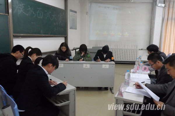 比赛伊始,主持人介绍评委嘉宾的到来。担任此次大赛的评委是思齐口才公司刘建强老师,新天地人力资源有限公司李庆新、韩勇老师,山东电视台主持人蒋家琪。本次比赛是复赛和决赛依次进行,从复赛胜出的同学直接进入决赛。复赛的形式为无领导小组讨论,18个参赛选手分为3组,每组6人,并随机抽签选择题目。每个小组首先就他们所抽中的题目进行10分钟无领导自由讨论,然后选出一名代表陈述小组的集体观点,最后评委就选手的具体表现进行点评。复赛环节中,来自信息学院2011级的刘培成以良好的仪态和悦耳的声音给评委和观众留下了深刻的印象。复赛后,12名同学进入决赛环节。决赛分为压力面试和专业技能测评两种形式。12位同学根据抽签决定决赛形式及出场顺序。选手以VCR或PPT展示自我本色,随后评委提问和点评。