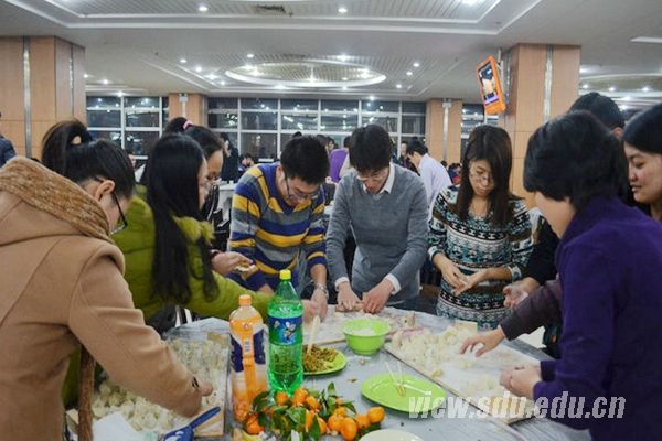 在各船长带领本组成员来到场地中央问候,摆出各种体现本舰主题的POSE后,包饺子环节正式开始。各组均领到了面粉、面团、饺子馅等食材以及面板、擀面杖、刀等用具,开始忙碌起来。组内成员相互指导,一个负责包饺子,一个负责擀面皮,饺子一个接着一个成形,不一会儿几百个饺子就整齐划一地摆上餐盘。饺子出锅后,同学们围坐在一起品尝着自己动手包的美味饺子,聊着最近校内校外发生的故事,畅想着未来,四处洋溢着家的味道,充满了家的温馨。吃饱喝足后,冬至节晚会迎来趣味游戏环节。“玩转地球”、“大眼瞪小眼”、“谁是卧底”三个游戏活跃了整个现场气氛,搞笑的动作和精彩的对决让现场成了一片欢乐的海洋。为了取得游戏的胜利,同学们个个使出绝招,用心备战,而最终获胜的选手获得了研究生会准备的精美小礼品。晚会在一片欢声笑语中结束。