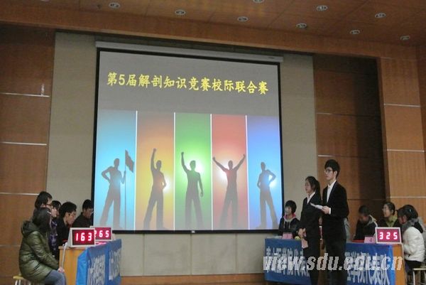比赛开始前,刘树伟为比赛致开幕词。他强调了解剖学学习的重要性,并表示竞赛是学习解剖学的好方法。本次比赛共分为顺序作答题、不定项选择题、必答题、标本识别和抢答题五个环节。各队选手自我介绍后进入答题环节。在前四个环节中,选手们思维敏捷,作答流利,体现出了他们对解剖知识的熟练掌握,博得了观众们的阵阵掌声。尤为值得一提的是,标本识别环节里,泰山医学院代表队和医学院代表队凭借丰富的专业知识、团结互助的协作精神和准确的表述赢得了评委的一致好评,均得到满分10分的好成绩。为增加比赛趣味性,缓解比赛的紧张气氛,比赛间隙还穿插了“猜词秀”和“绝处逢生”两个互动环节,场下观众积极参与,现场气氛热烈活跃。