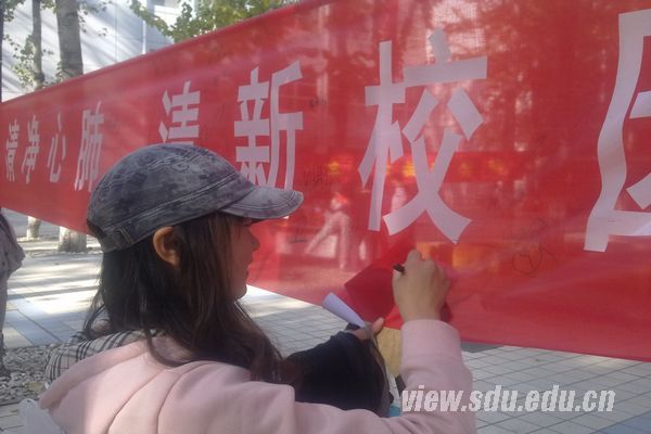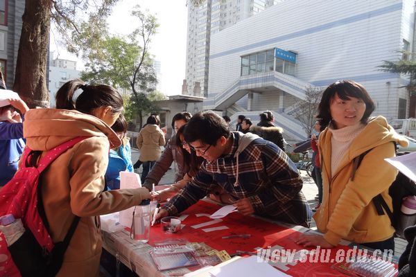 在中心校区的活动现场,一条写满签名的红色条幅吸引了很多人的注意。条幅上写着“清净心肺,清新校园”。当你决定加入禁烟这个行列时,你就可以在条幅上签下名字,表明你对禁烟活动的支持。条幅上满满的签名,表明了山东大学师生对建一个无烟清新校园想法的认可。清新醒目的宣传标语、展台上的丰厚奖品,不仅吸引了在校师生,也把许多来校参观的游人吸引过来,加入答题队列。答题活动的规则为,答题者从工作人员事先准备的不透明盒子中抽一张卡片,抽到数字即为试题号,每套试题有5个选择题,试题内容全部与禁烟知识有关;答题者根据题号答题,限时2分钟;若答题者在2分钟内能答对4题或4题以上,即可获得由唐仲英爱心社提供的精美礼品一份,如不符答题要求,仍可获得一份精美的禁烟书签。很多参加活动的人表示,虽然选题难度不大,较大众化,但由于自己在禁烟方面还缺乏清晰具体的认识,答题仍然会出错。活动使他们了解到了很多健康常识,受益匪浅。